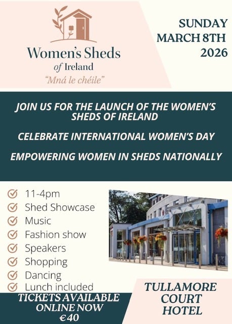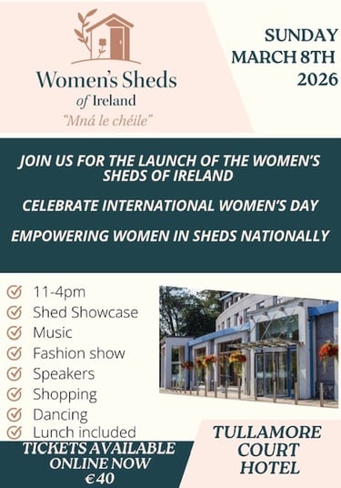 The official launch of Women’s sheds of Ireland will be held in Tullamore, Co. Offaly on International Women’s Day, 8th March, 2026.